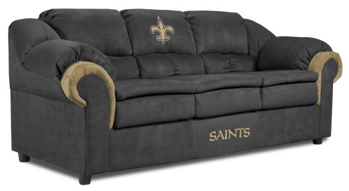 Bring the tailgating party home and watch every Saints game on TV sitting on this soft, comfortable, and durable Saints sofa. Perfect for any family room, living room, or office, you'll be the envy of your friends and your team's most loyal fan. Officially licensed, this sofa features an easy-to-clean microfiber suede fabric in the Saints team colors. Soft poly cushions have an attached Dacron fiber wrap with 1.4 density foam and 32-pound compression. The sofa also features a sturdy engineered hardwood frame and a comfortable, no-sag wire suspension.