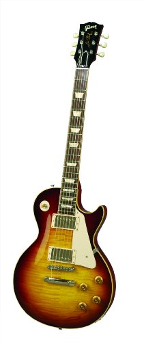 The 1959 Les Paul Standard reissue produced today by Gibson Custom is true to all of the original instrument's features and characteristics, including Gibson's traditional hand-carved "figured" maple top and solid, non-weight relieved mahogany body. The headstock is made from Holly head veneer, as opposed to fiber, just like it was in 1959, and the vintage-style tulip tuners are mounted in a straight line, also as they were on the original. The 24 3/4-inch scale length neck is made from one solid piece of mahogany, and attached to the body using a long neck tenon--one of the Les Paul's more distinguishing characteristics of the 1950s. The neck is topped by a 22-fret rosewood fingerboard outfitted with acrylic trapezoid inlays matching the size and color of the originals. Of course, two of Gibson's legendary Burstbucker pickups deliver all the subtle variations of true, classic "Patent Applied For" humbucker tone by using historically "unmatched" bobbin windings and Alnico II magnets. Other historical appointments include CTS potentiometers, bumble bee capacitors, rolled creme-colored fingerboard binding, single-ply creme-colored binding around the body, and a period-correct thin toggleswitch washer and jackplate. The 1959 Les Paul Standard comes in either a V.O.S. or Gloss finish, and with the standard Gibson Custom case, custom care kit and certificate of authenticity. They are available in Faded Tobacco Burst, Washed Cherry Burst and Iced Tea Burst.