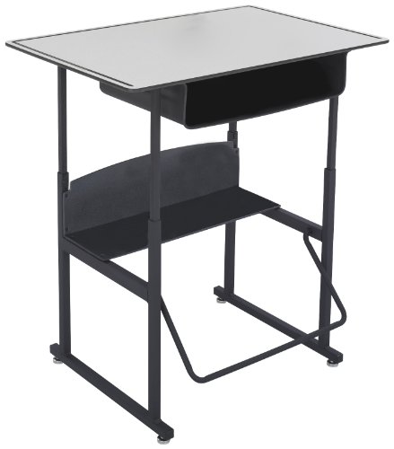 With the AlphaBetter Desk students have a new desire to learn. Designed for students in grades 3-12, the AlphaBetter Desk easily adjusts from 26-inch to 42-inch high to allow students the choice to stand or sit while in the classroom. With our exclusive patent-pending Pendulum Footrest Bar students have a new way to sway. The footrest allows students to swing their feet providing extra movement to burn off excess energy. In addition it helps to correct posture. The steel frame with Black powder coat finish is built for long lasting durability. Our large phenolic desk top will withstand the heavy use of the classroom. The steel book box stores books and supplies and a lower shelf provides additional storage space.